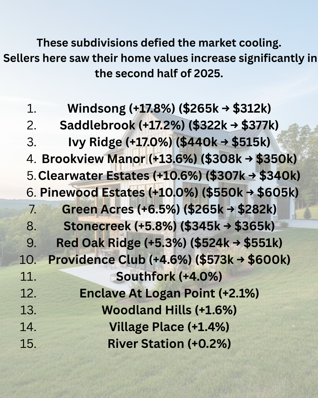 These subdivisions defied the market cooling. Sellers here saw their home values increase significantly in the second half of the year.